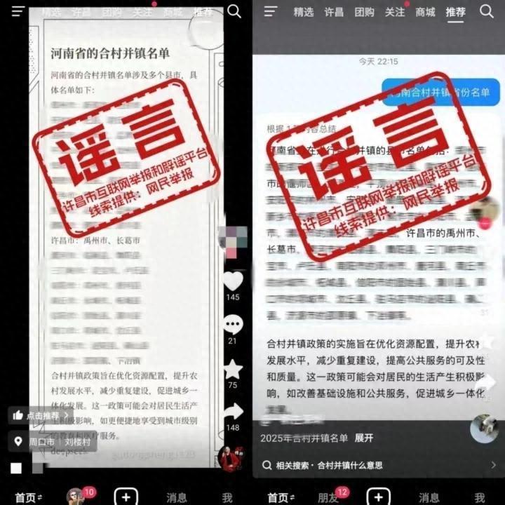 近日,许昌市委网信办接群众举报,多个短视频账号发布视频信息称,“许昌市:禹州市、长葛市合村并镇”。经向市民政局核实,许昌市合村并镇规划系虚假不实信息。